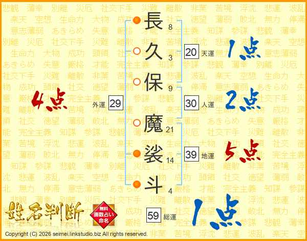 長(8画)久(3画)保(9画) 魔(21画)裟(14画)斗(4画)