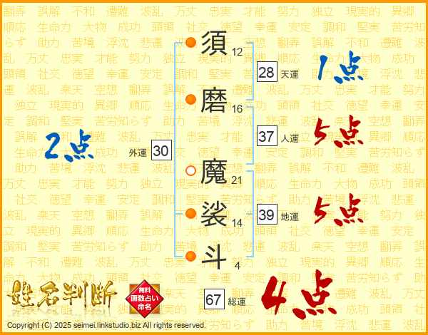 須(12画)磨(16画) 魔(21画)裟(14画)斗(4画)