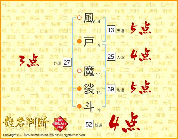 風(9画)戸(4画) 魔(21画)裟(14画)斗(4画)