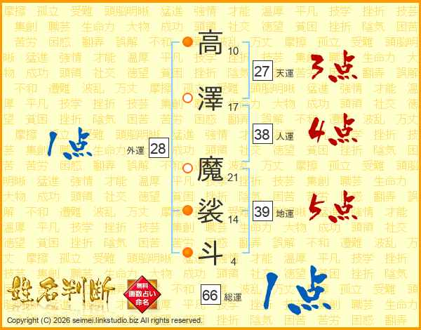 高(10画)澤(17画) 魔(21画)裟(14画)斗(4画)