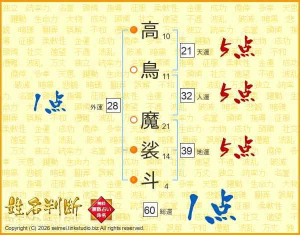 高鳥魔裟斗さんの天運は21画の5点!