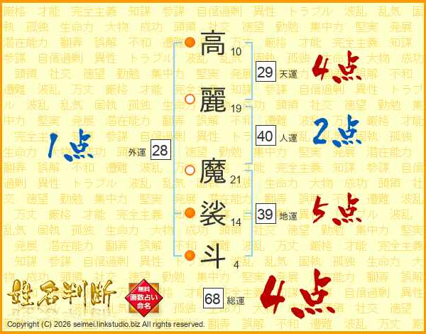 高(10画)麗(19画) 魔(21画)裟(14画)斗(4画)