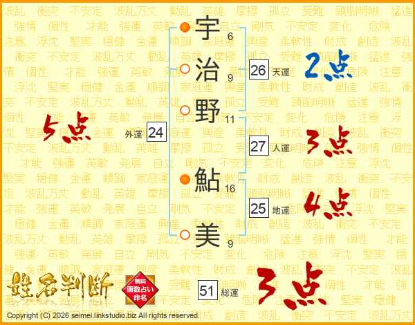 宇(6画)治(9画)野(11画) 鮎(16画)美(9画)