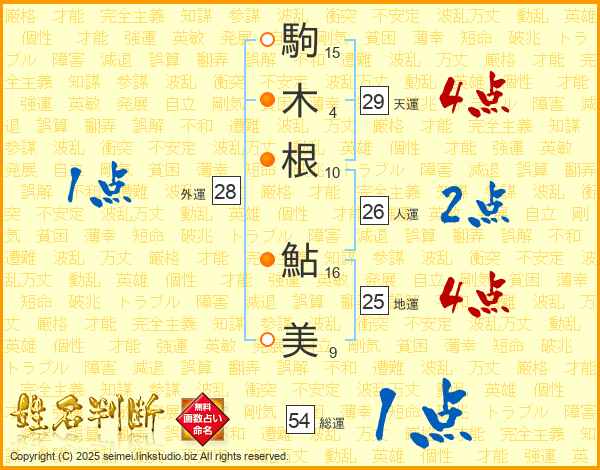 駒(15画)木(4画)根(10画) 鮎(16画)美(9画)