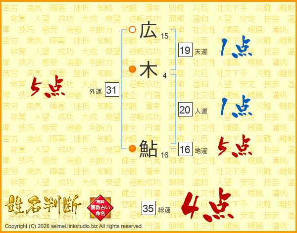生活面を象徴する運勢です。外部から受ける影響力を表し、結婚運、家庭運や職場、環境への順応性を表します。総運から人運を引いた画数。姓や名が1文字の場合を除く。
