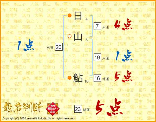 あなたの人生を表す1番重要な運勢です。生涯を通じて影響する総合運となり、主に50歳以降の晩年期に影響を及ぼします。苗字と名前の合計画数。