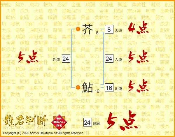 生活面を象徴する運勢です。外部から受ける影響力を表し、結婚運、家庭運や職場、環境への順応性を表します。総運から人運を引いた画数。姓や名が1文字の場合を除く。