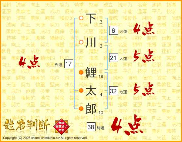 下(3画)川(3画) 鯉(18画)太(4画)郎(10画)
