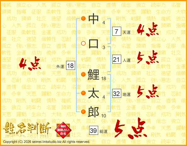 中(4画)口(3画) 鯉(18画)太(4画)郎(10画)