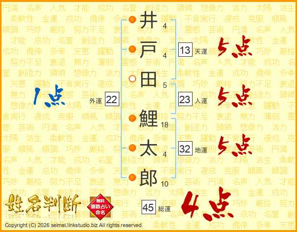 井(4画)戸(4画)田(5画) 鯉(18画)太(4画)郎(10画)