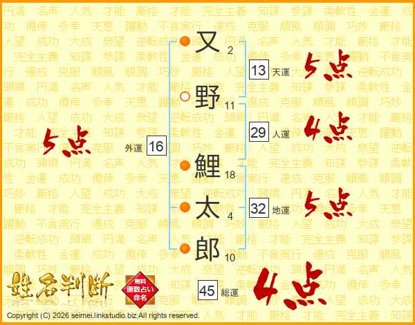 又(2画)野(11画) 鯉(18画)太(4画)郎(10画)