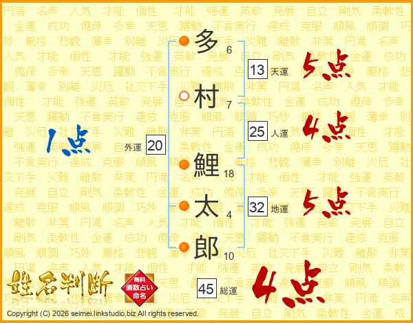 多(6画)村(7画) 鯉(18画)太(4画)郎(10画)