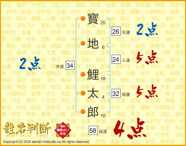 寳(20画)地(6画) 鯉(18画)太(4画)郎(10画)