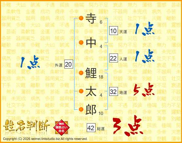 寺(6画)中(4画) 鯉(18画)太(4画)郎(10画)