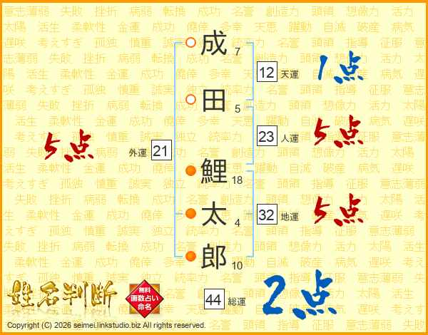 成(7画)田(5画) 鯉(18画)太(4画)郎(10画)