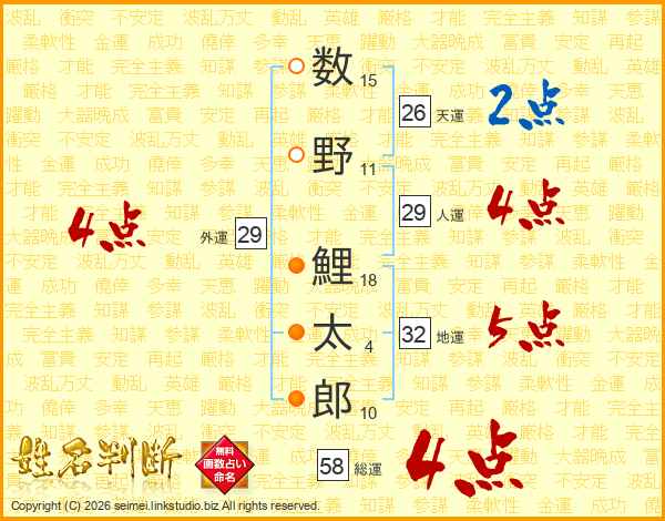 数野鯉太郎さんの総運は58画の4点!