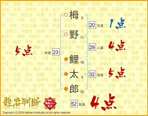 栂(9画)野(11画) 鯉(18画)太(4画)郎(10画)