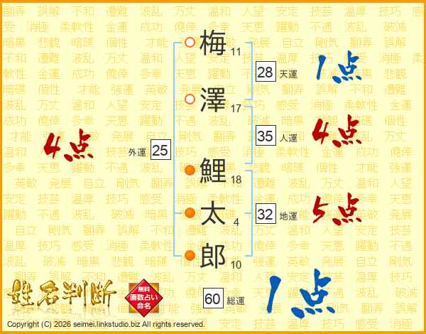 梅(11画)澤(17画) 鯉(18画)太(4画)郎(10画)