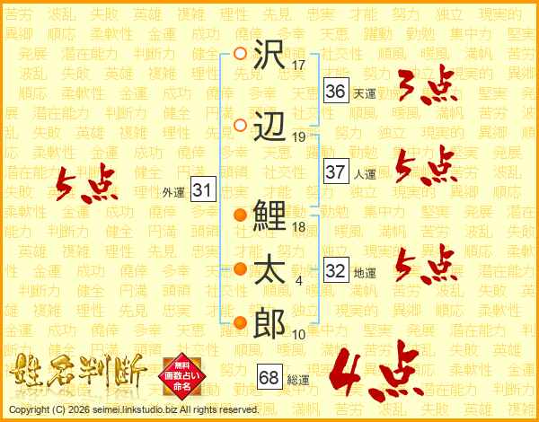 沢(17画)辺(19画) 鯉(18画)太(4画)郎(10画)
