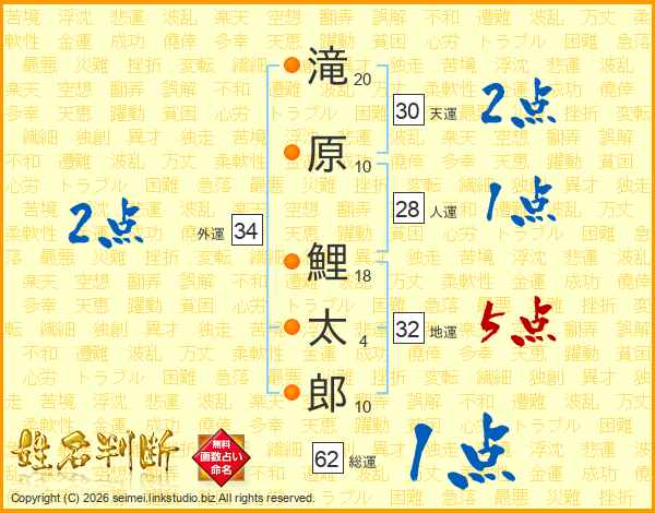 滝(20画)原(10画) 鯉(18画)太(4画)郎(10画)