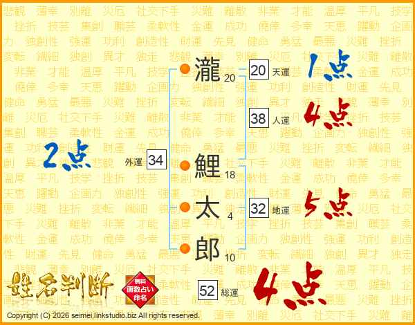 瀧鯉太郎さんの総運は52画の4点!