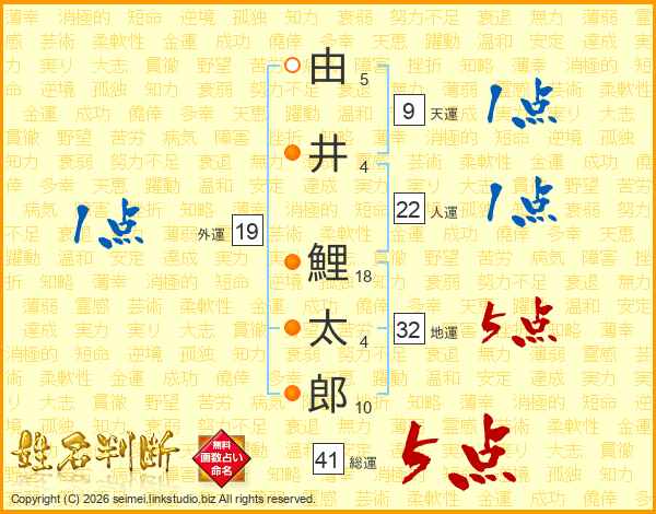由(5画)井(4画) 鯉(18画)太(4画)郎(10画)