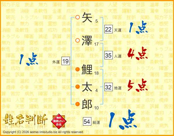 矢(5画)澤(17画) 鯉(18画)太(4画)郎(10画)