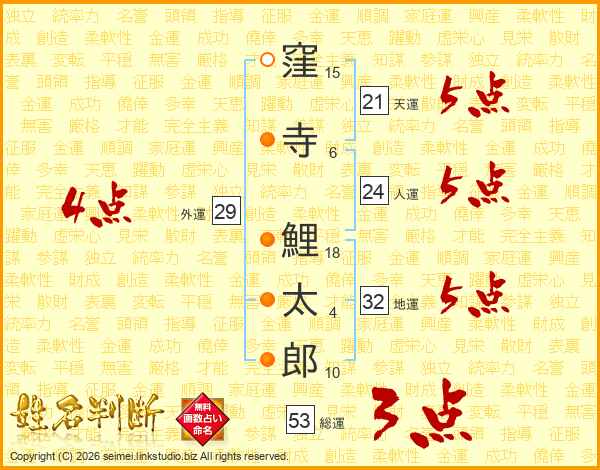 窪(15画)寺(6画) 鯉(18画)太(4画)郎(10画)