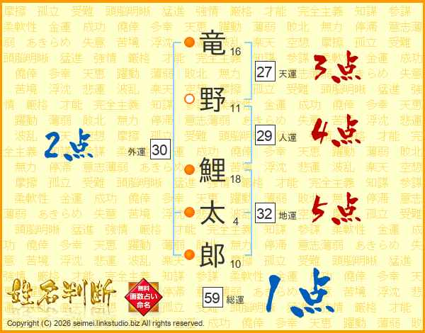 竜野鯉太郎さんの総運は59画の1点!