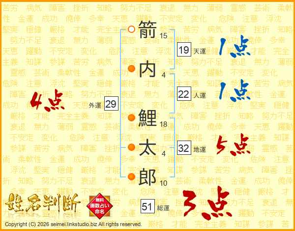 箭(15画)内(4画) 鯉(18画)太(4画)郎(10画)