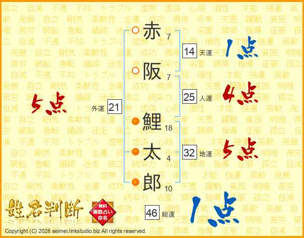 赤(7画)阪(7画) 鯉(18画)太(4画)郎(10画)