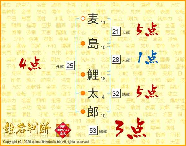 麦島鯉太郎さんの総運は53画の3点!