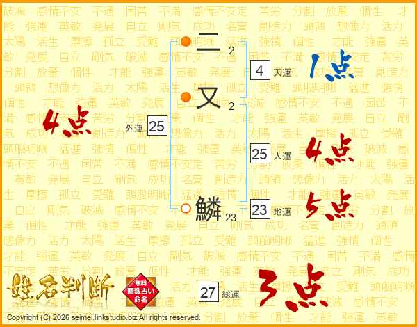 二又鱗さんの総運は27画の3点!