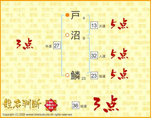 戸沼鱗さんの総運は36画の3点