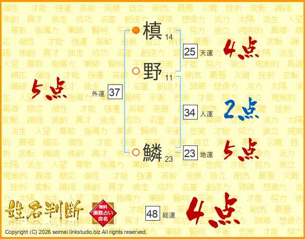 あなたの人生を表す1番重要な運勢です。生涯を通じて影響する総合運となり、主に50歳以降の晩年期に影響を及ぼします。苗字と名前の合計画数。