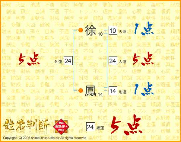 生活面を象徴する運勢です。外部から受ける影響力を表し、結婚運、家庭運や職場、環境への順応性を表します。総運から人運を引いた画数。姓や名が1文字の場合を除く。