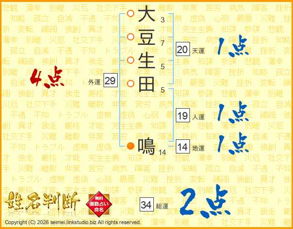 大豆生田鳴さんの総運は34画の2点!