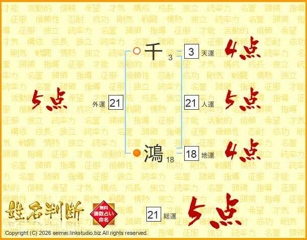 あなたの人生を表す1番重要な運勢です。生涯を通じて影響する総合運となり、主に50歳以降の晩年期に影響を及ぼします。苗字と名前の合計画数。