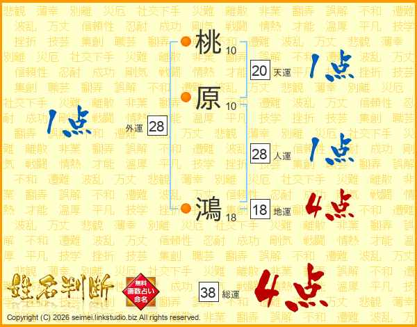 生活面を象徴する運勢です。外部から受ける影響力を表し、結婚運、家庭運や職場、環境への順応性を表します。総運から人運を引いた画数。姓や名が1文字の場合を除く。