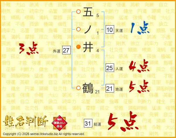 五(5画)ノ(1画)井(4画) 鶴(21画)