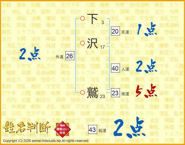 下沢鷲さんの総運は43画の2点!