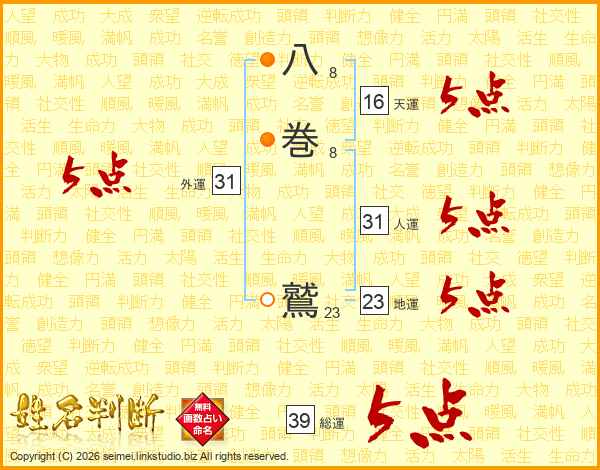 八巻鷲さんの総運は39画の5点!