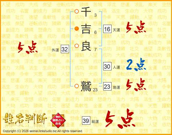 千吉良鷲さんの総運は39画の5点!
