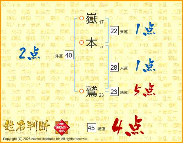 嶽本鷲さんの総運は45画の4点!