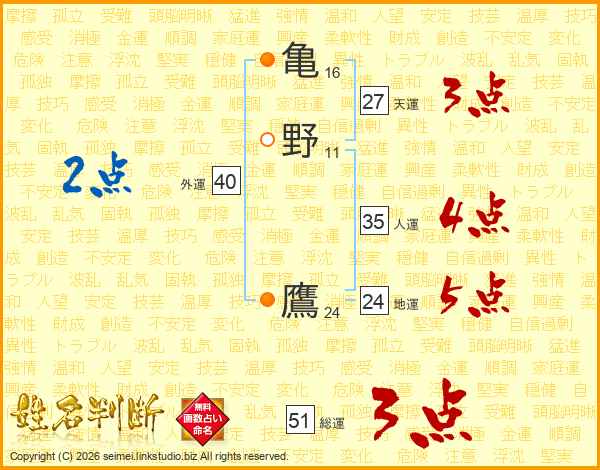 亀野鷹さんの総運は51画の3点!