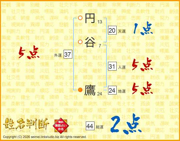生活面を象徴する運勢です。外部から受ける影響力を表し、結婚運、家庭運や職場、環境への順応性を表します。総運から人運を引いた画数。姓や名が1文字の場合を除く。