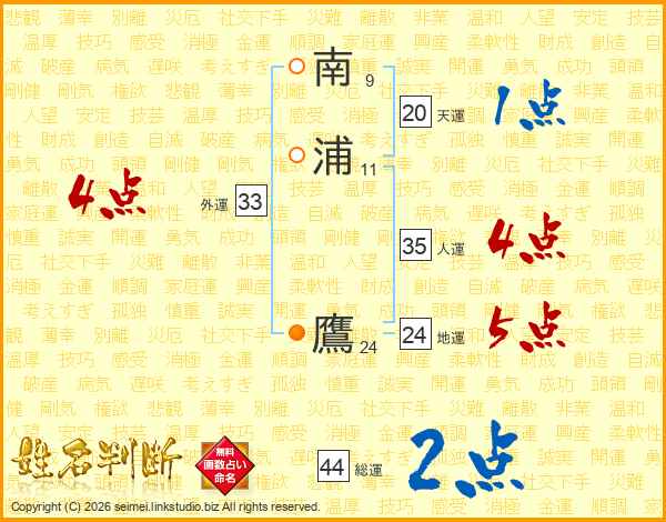 生活面を象徴する運勢です。外部から受ける影響力を表し、結婚運、家庭運や職場、環境への順応性を表します。総運から人運を引いた画数。姓や名が1文字の場合を除く。