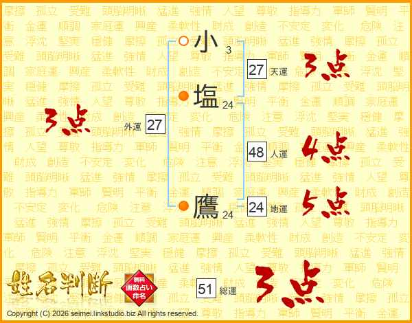 生活面を象徴する運勢です。外部から受ける影響力を表し、結婚運、家庭運や職場、環境への順応性を表します。総運から人運を引いた画数。姓や名が1文字の場合を除く。