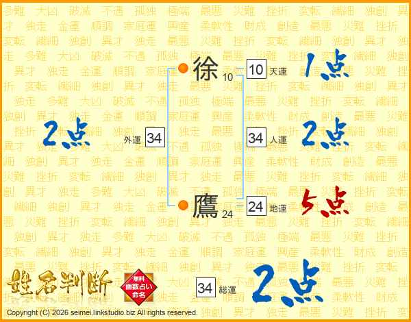 生活面を象徴する運勢です。外部から受ける影響力を表し、結婚運、家庭運や職場、環境への順応性を表します。総運から人運を引いた画数。姓や名が1文字の場合を除く。