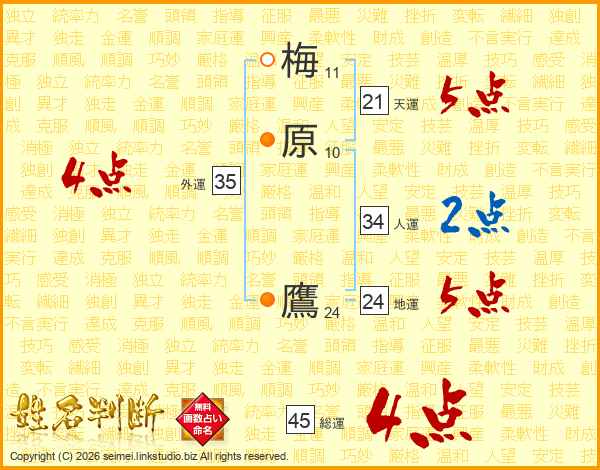あなたの人生を表す1番重要な運勢です。生涯を通じて影響する総合運となり、主に50歳以降の晩年期に影響を及ぼします。苗字と名前の合計画数。